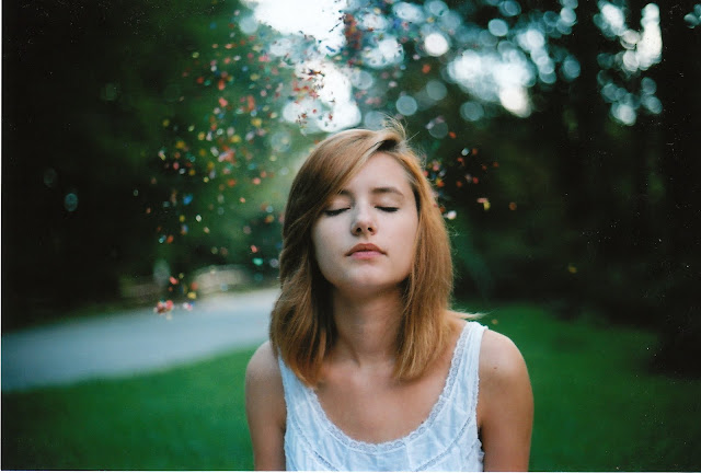 es una hermosa foto: la pacifica atmosfera del lugar, la expresion contemplativa de un bello rostro, los colores del confeti contrastando con el verde del fondo: lo que está en el encuadre....